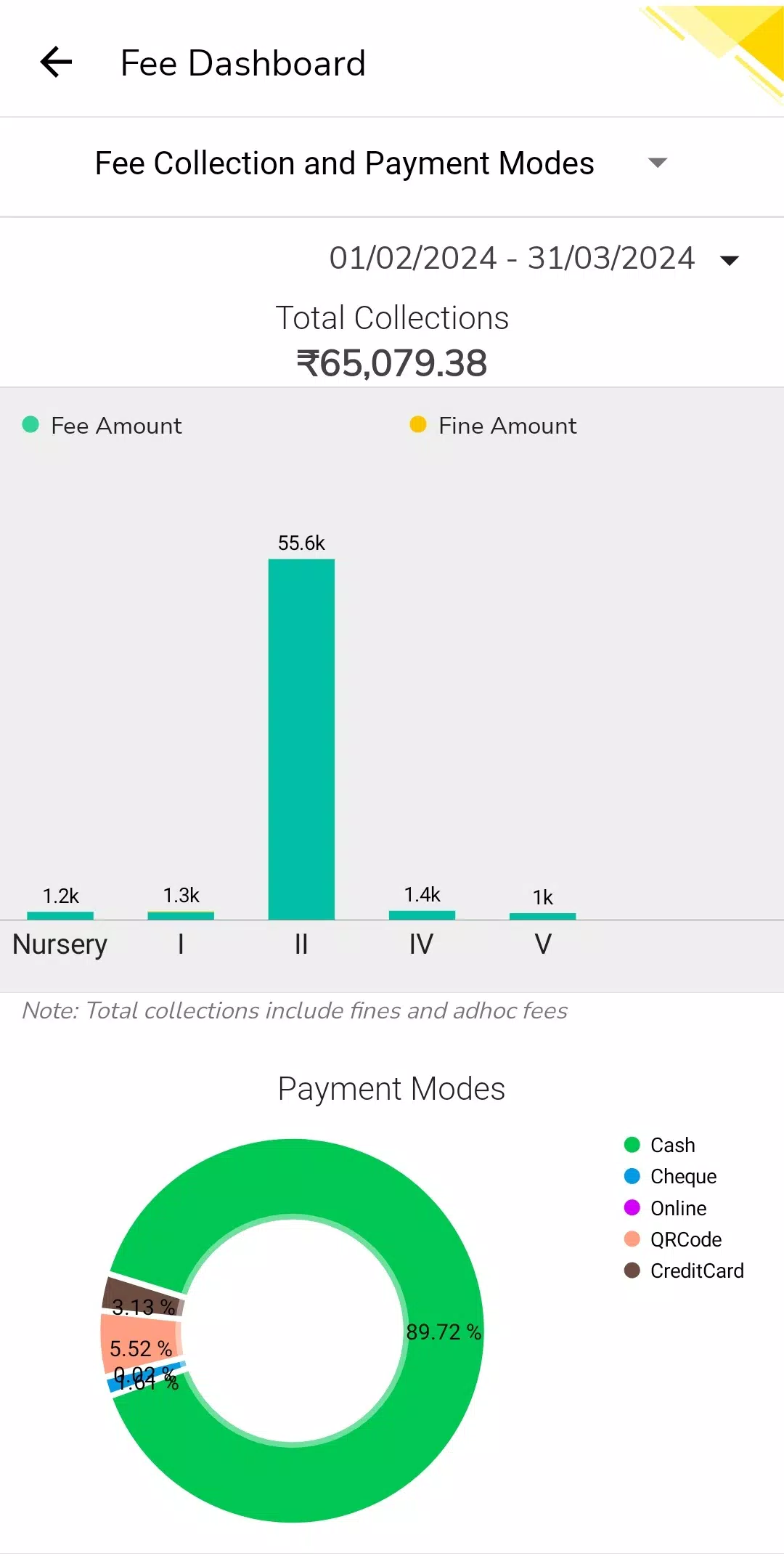 - Viewing total fee collection, defaulters list, fines, and concessions
