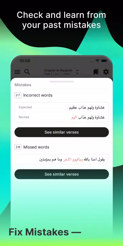 開始背誦,每當您錯過一個單詞,使用錯誤的單詞或說一個單詞太多時,您都會收到通知!塔托爾將突出您的錯誤並保持跟踪,以便您下次進行修改和審查。目前,此功能不包括Tajweed或發音校正,但我們知道社區需求,這是我們未來的路線圖!